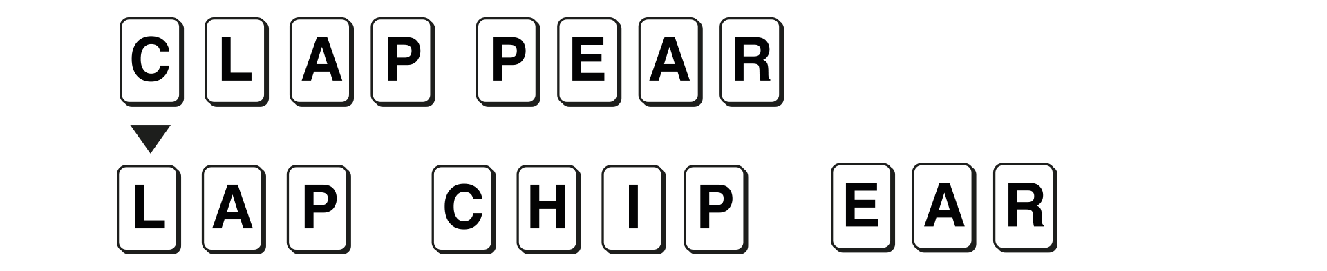 Å×À̺í À§¿¡´Â CLAP°ú PEAR°¡ ³õ¿©Á® ÀÖ´Ù. °ÔÀÓÀÚ´Â C¿Í P¸¦ °¡Á®¿Í¼ »õ·Î¿î ´Ü¾î LAP, CHIP, EARÀ» ¸¸µç´Ù.